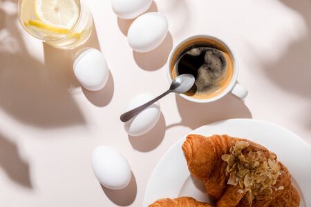 top view of chicken eggs, water with lemon, coffee and croissants for breakfast on grey table with shadows