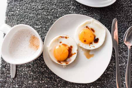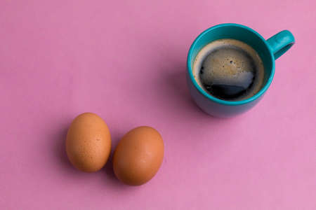 Minimal composition of traditional healthy italian food. Tasty and fresh brown chicken eggs, raw and cooked, with their yellow yolk and egg white. Breakfast with fresh italian coffee in a mug. Protein breakfast.