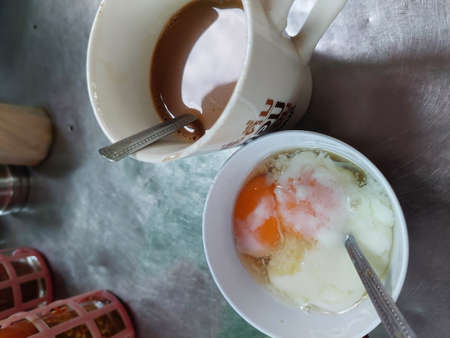 Breakfast food with soft-boiled eggs and vintage coffee Thai style for sale at Thai street food market or Thai vintage style coffee shop restaurant in Thailand