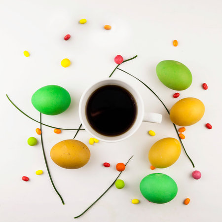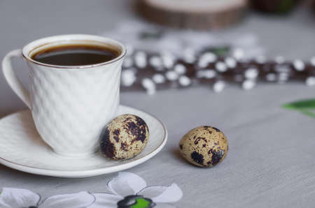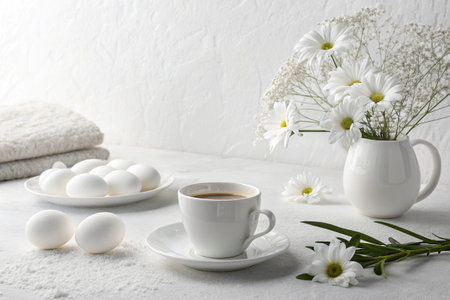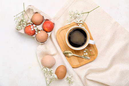Composition with Easter eggs, cup of coffee and gypsophila flowers on light background