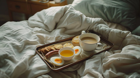 Lazy morning brunch on bedroom tray with poached eggs, omelette, and coffee, styled breakfast table with warm sunlight and comfort.