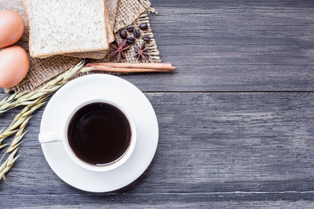 Ears of wheat,egg and coffee with slice of bread on a dark wooden table background.top view with copy space