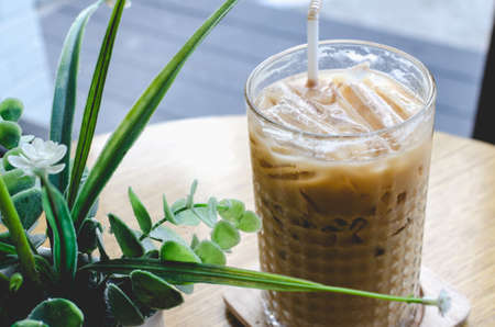 Close-up glass of iced coffee with milk on the table