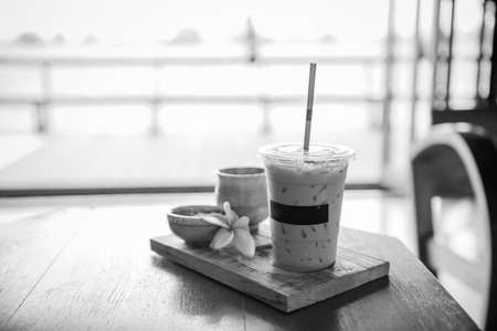 black and white of Ice coffee and some biscuits on the table