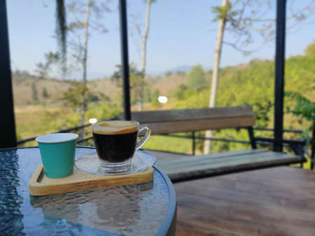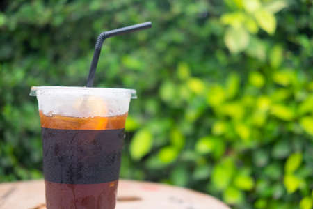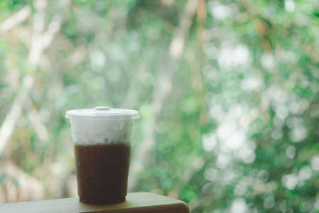 Iced black coffee with green leaf tree background