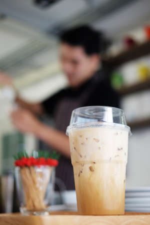 Iced coffee in plastic glass at cafe for take away