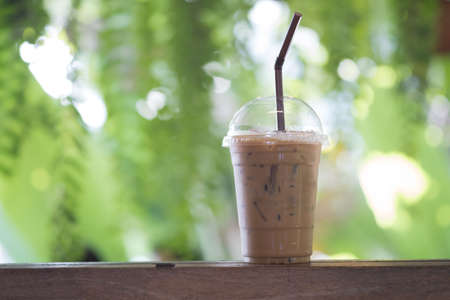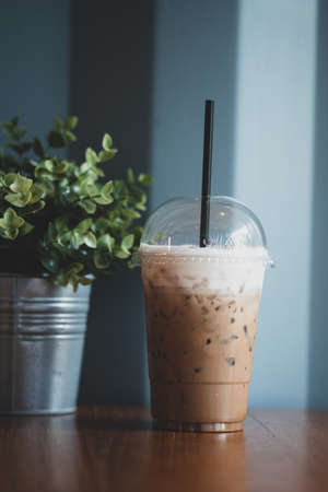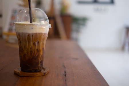 Closeup Plastic glass of iced coffee with milk on blurred background.