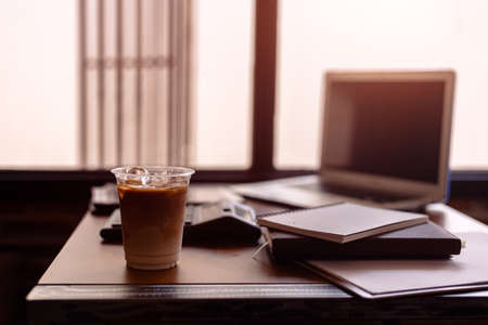 Ice coffee on office workplace with laptop, calculator, book and document on wood table