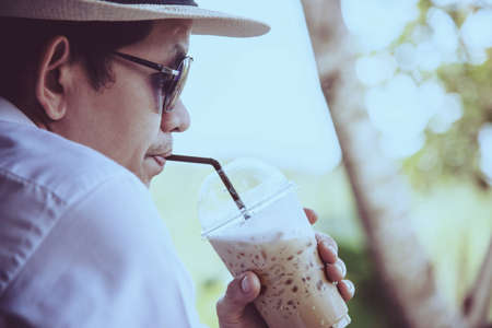 Casual Asian man drink ice coffee happily in nature - people with coffee in nature concept