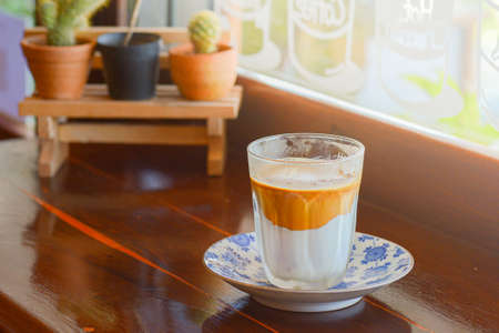 Milk coffee on the wooden table in the morning