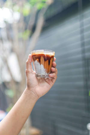 Iced mocha coffee served in the designed double-wall glass at coffee cafe. Look delicious, concept of coffee break time. Chilling and relax.