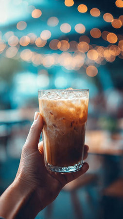 Iced coffee in a glass with blur bokeh background.