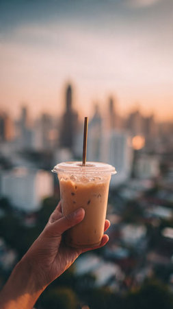 Iced coffee in hand on the background of the cityscape.
