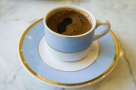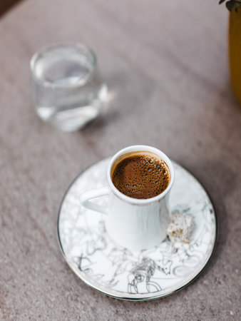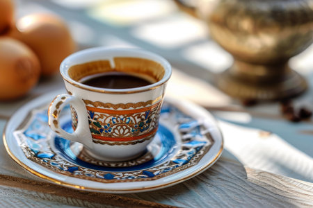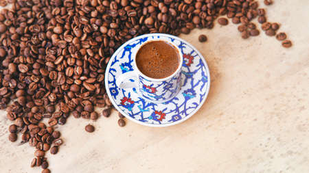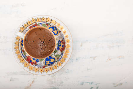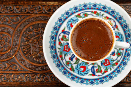 Turkish hot coffee in traditional painted cup close up view on the table in cafe
