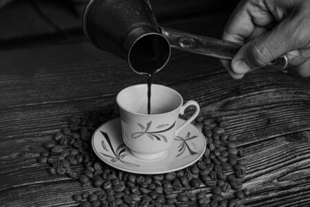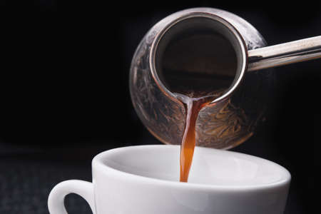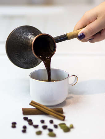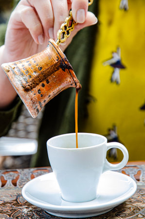 Hand holding metal coffee pot (aka cezve) and putting traditional Turkish coffee to metal cup.