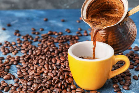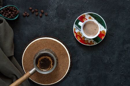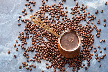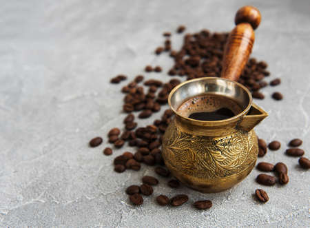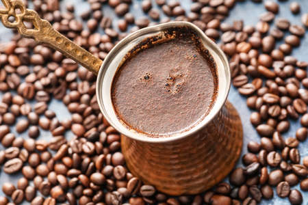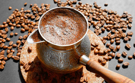 Fresh-made Turkish coffee in coffee-pot with long handle on scattered coffee-beans