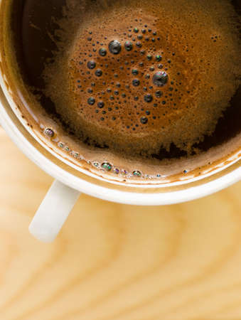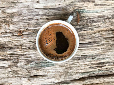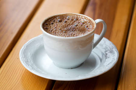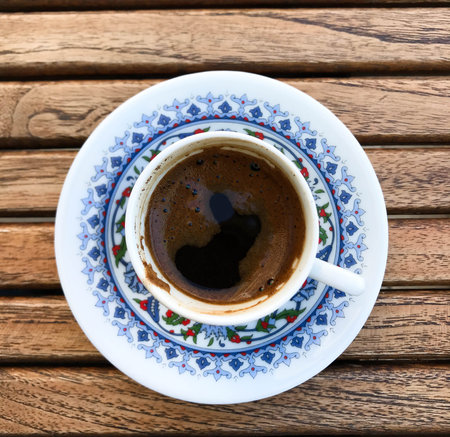Vintage cup of Turkish coffee on a saucer over wooden surface background, viewed overhead with copy space to the side