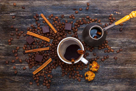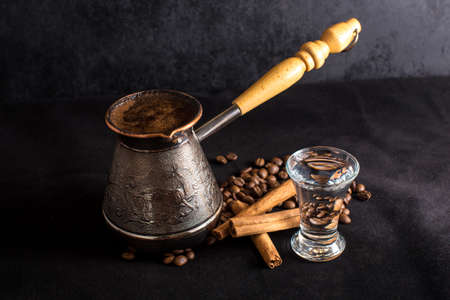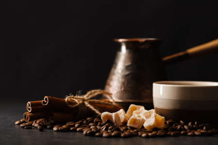 Turkish coffee, with coffee beans and cinnamon on dark background