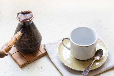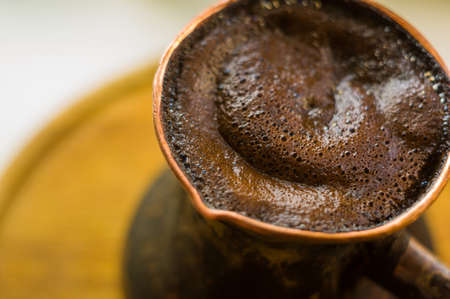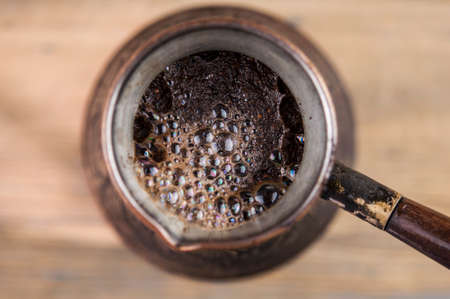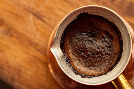 ready-made turkish coffee in a cezva in a turk on the table top view