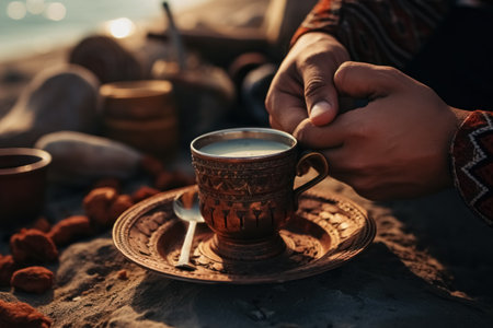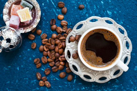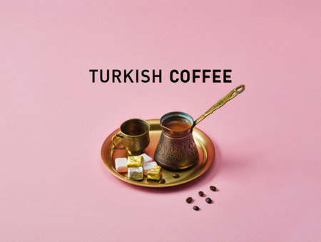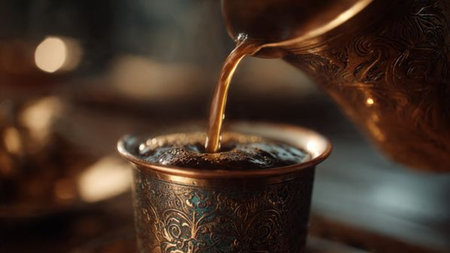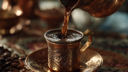 Close-up of Turkish coffee in a brass cup, accompanied by coffee beans, showcasing the heritage and deep flavors of this ancient brew