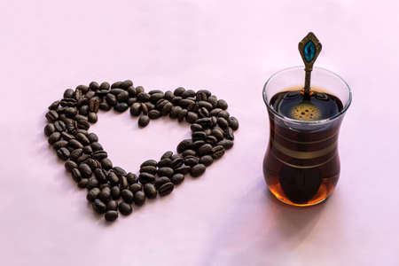 Cafes and restaurants. A mug of invigorating, black coffee with heart shaped and coffee beans. Place for an inscription. The concept of hot drinks and love.