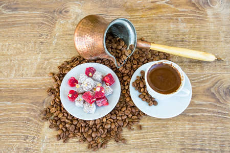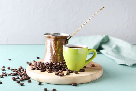 fresh roasted coffe beans in cezve (traditional turkish coffee pot) closed book and cup on wooden table.