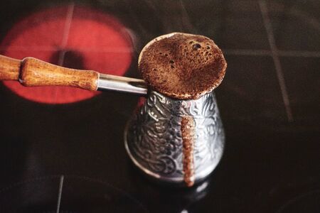 Coffee boiling in a Turk on an electric stove. Close-up of turkish black coffee preparation in vintage turk. A red hot circle of an electric stove with a Turk on it.