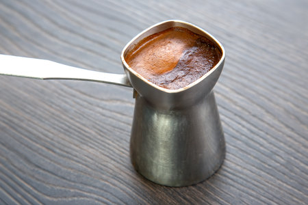 Close-up of a traditional cezve with creamy Turkish coffee on a dark wood table. Suitable for coffee enthusiasts, cultural studies, or gourmet food visuals.