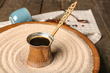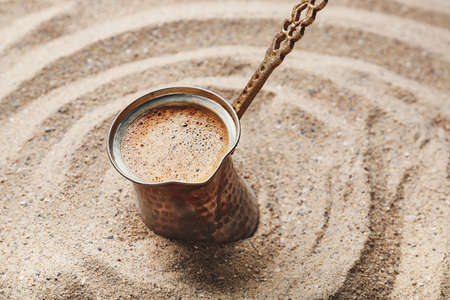 Brewing coffee in copper cezve on sand. Traditional turkish method