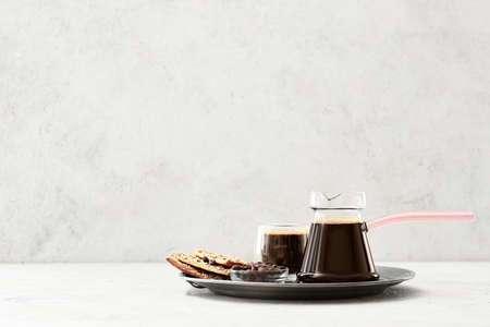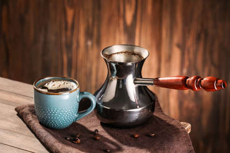 Hot turkish coffee pot on wooden table. aroma drink beverage