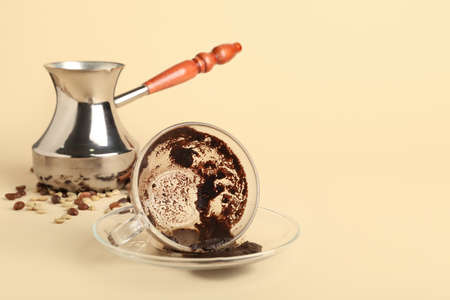 Leftover coffee, sediment, precipitate black turkish coffee in ceramic white cup, top view