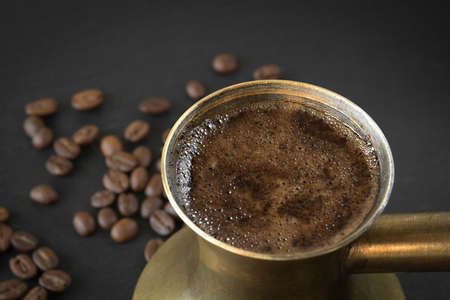 Turkish coffee in a copper cup on a dark background. Selective focus.
