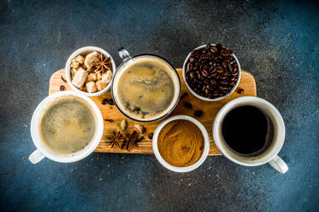 Three coffee cups, beans, ground coffee and brown sugar. Dark blue background top view space for your text