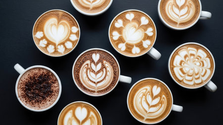 A beautifully arranged collection of coffee cups featuring diverse brews and intricate latte art, perfect for coffee lovers and enthusiasts.