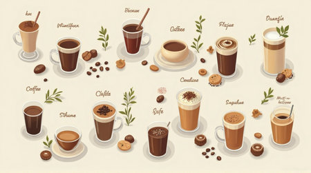 Variety of Coffee Drinks Displayed with Coffee Beans and Decorations