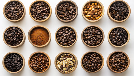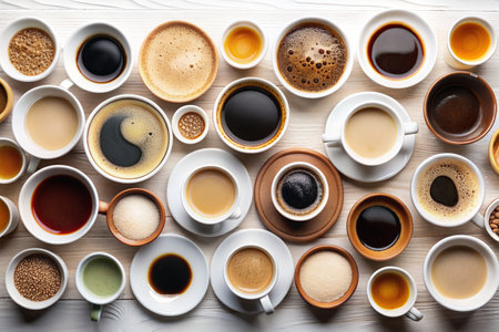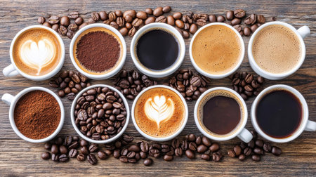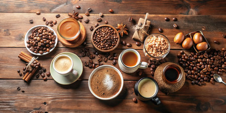 Aerial perspective of diverse coffee varieties creating a rich coffee themed background