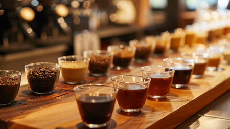 A stunning array of coffee cups showcasing different brews and beans highlights the rich diversity and artistry of coffee culture.