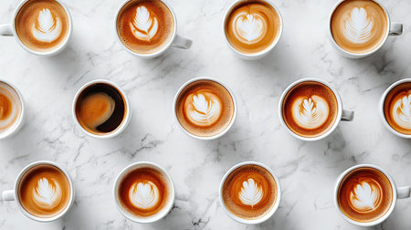 An aerial shot of coffee cups featuring unique latte art designs on a sleek marble surface. This captivating image captures the essence of coffee culture and the beauty of intricate foam patterns. Perfect for food and beverage themes, coffee shops, and culinary delight.