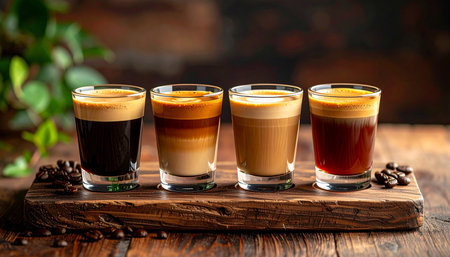 A stunning display of various coffee drinks in stylish glasses, featuring rich textures and inviting colors. Perfect for showcasing coffee culture and indulgent treats.