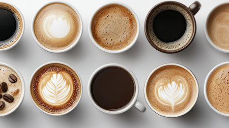 A top-down view of various coffee cups on a white background, each cup featuring a different type and color of coffee, creating a vibrant display