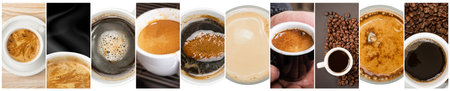 Coffee Cups Drink Collage. Various Coffee Collection, Different Beverage Mix, Black Espresso Assortment