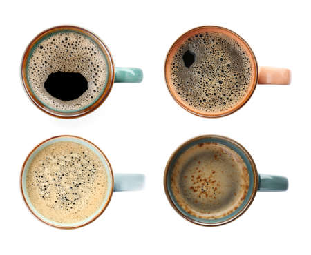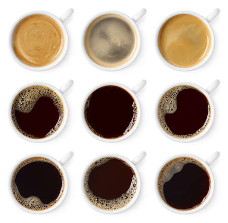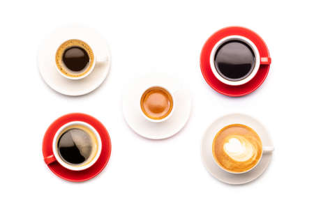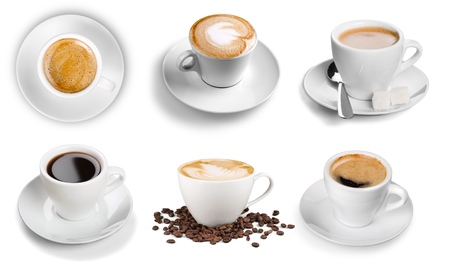 Great collection of various types and ways of drinking coffee with beverage in white ceramic cup isolated on white table with ingredients. Top view.