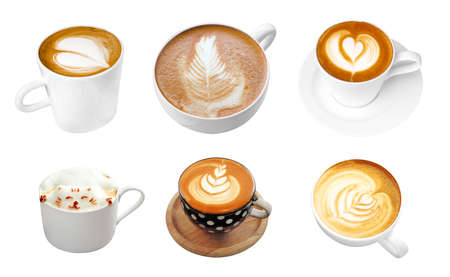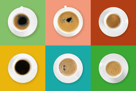 Buch of coffee cups with different kind of beverage and different latte art foam designs. Top view, close up, background.