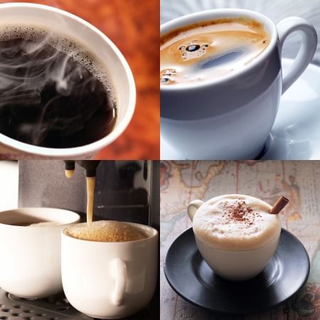 Coffee collage set of arabica or robusta in a cup of cafe. Photo in vintage color tone style.