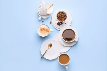 Lots of coffee cups with different types of coffee, cappuccino and macchiatoon on blue background with blank space for text. Top view, lat lay.