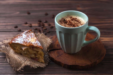 Cup with coffee and apple pie on a rural wooden tabletop. Latte or cappuccino with chocolate sprinkles. Apple Charlotte