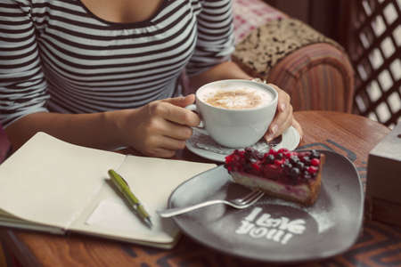 Woman holding a cup of coffee and a piece of cake in cafe