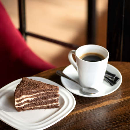 Piece of chocolate cake and cup of coffee. Dessert snack with white interlayers and cup of Americano on wooden table. Good morning concept. Coffee break.
