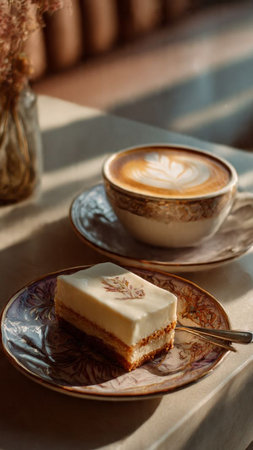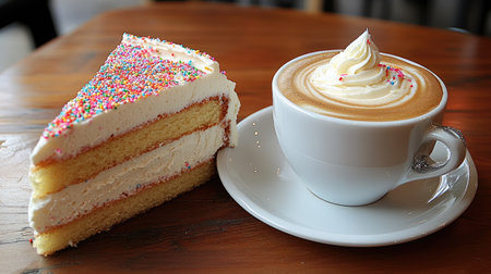 A decadent slice of vanilla cake with buttercream frosting and sprinkles, served with a hot cappuccino in a caf.