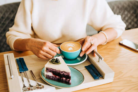 Mature womans hands holding a cup of cappuccino coffee and a cream cake. Adult lady in white sweater enjoying her breakfast latte and dessert pie on a wooden tray in a cafe.